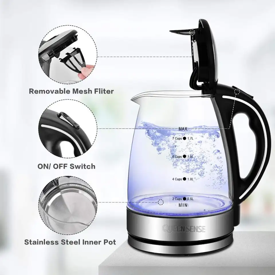 1- This is a 120V 1.7L Automatic LED Light Electric Glass Kettle.Applicable Industries:Hotel, Commercial, HouseholdPower Source: ElectricMateri