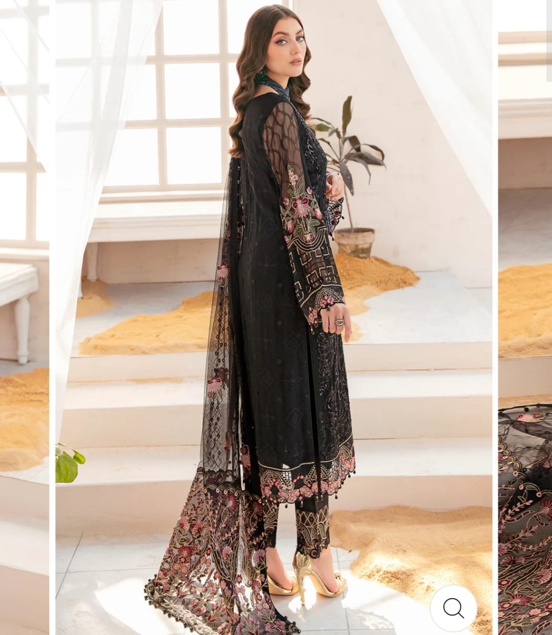 Embroidered chiffon front with sequins Embroidered chiffon back Embroidered sleeves Organza sleeves lace Embroidered organza ghera lace Embroidered net dupatta 2.5 meter Raw silk trouser
