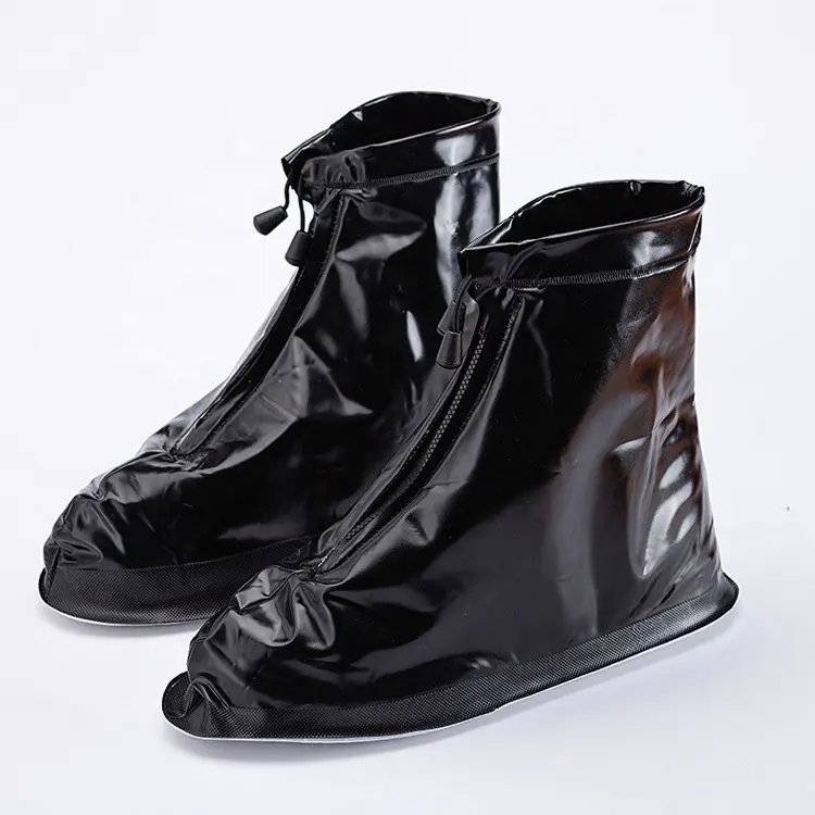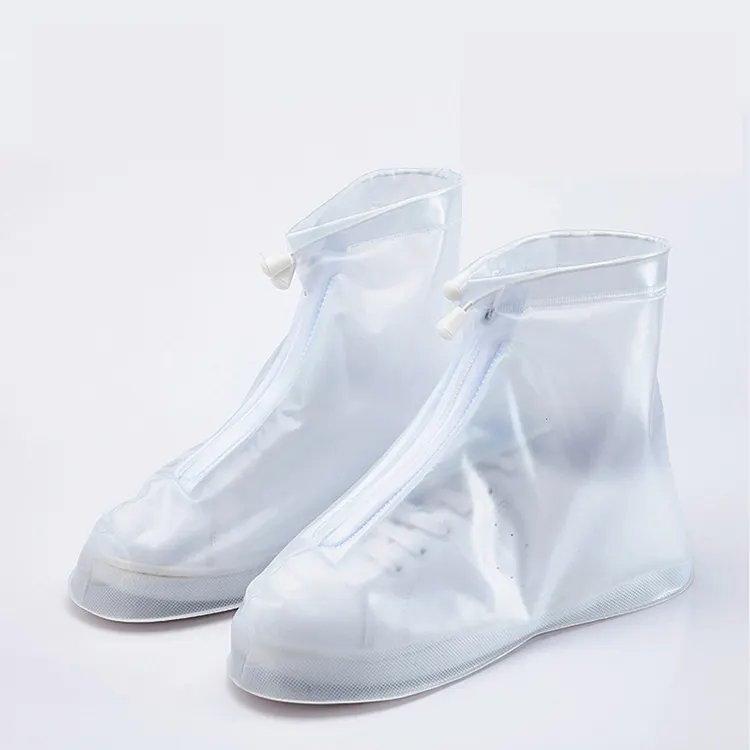 This disposable plastic PVC waterproof rain boot cover is reusable for shoes of different sizes. The shoe cover comes in small, medium, and large sizes