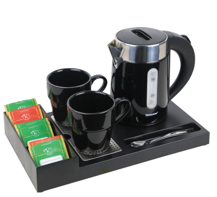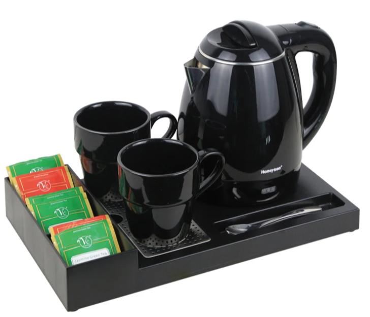 | Welcomed Hotel Electric Tray Organized Beverage Station | Keeps kettle, cups, and condiments neatly arranged. |