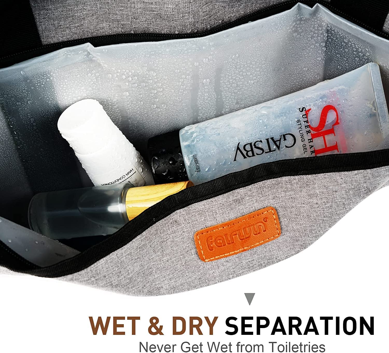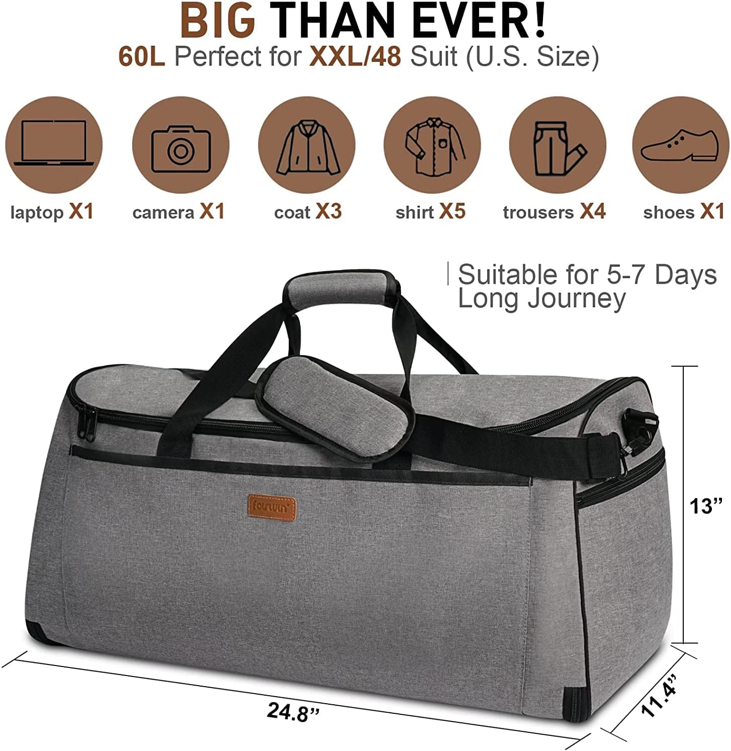 FAIRWIN Garment Bags for Travel Suit Bags for Men 60L Waterproof Carry On Hanging Garment Duffle Bag for Men Convertible Garment Bag with Shoes Compartment 2-in-1 Suit Carrier Weekender Bag, Grey, 60LColour | Grey Material | Nylon Special feature | Waterproof About this item▶Upgrade the Oversized 60L Capacity Garment Duffle Bag to Meet Your Need. Fairwin upgrade carry-on garment bag can meet the shoulder width up to size 52 or XXL+ suits. And you can pack everything you need to travel and business trip. For example, suits, tuxedos, trench coats, shoes, towels, toothbrushes, laptops, power banks, and so on. Large-capacity suit bags are an indispensable part of men's travel.▶Upgrade SBS Zipper, More Durable and Explosion-proof. Fairwin men's duffle bag upgraded the zipper design, using SBS zippers compared with other duffle garment bag zippers on the market, which have been tested thousands of times without breaking. Also, the upgraded fully closed design of one zipper is better than the three on the market as our one zipper is more convenient and safe to open.▶Hanging Garment Bag Keeps Your Clothes Unwrinkled. Our carry-on duffel bag is specially designed to keep your clothes, dress clean, neat, and wrinkle-free! An interior dual buckle holds your garments in place, ensuring that they don’t crease or crumple during travel, so you will have more time relaxing and less time Ironing suit, make you a cool suit man.▶Dry Wet Separated Garmet Traveler Bag. The moist separated compartment is specially designed for storing wet items or dirty clothes after exercises, such as socks, underwear, swimwear, towel, or swimming goggles. Not only garment traveler bags for suits but also dry wet separated hanging bags for clothes travel.▶Premium Durable Tear-Resistant/Water-Resistant Material: The convertible garment bag is made of high-quality polyester fiber, shock-resistant and waterproof/tear-resistant to protect your suits or dress better. All accessories are made of metal, which is stronger and prevents breakage.