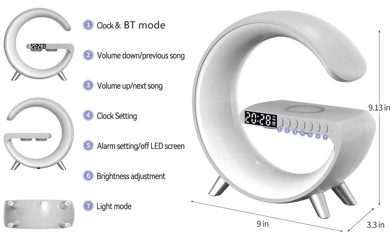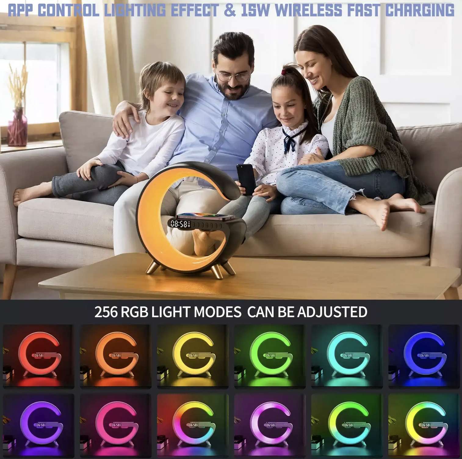 Wireless Phone Charger 5 in 1 Portable G-shaped 15W With Alarm Clock LED Light Wireless Speaker Smart Bedside Table Lamp