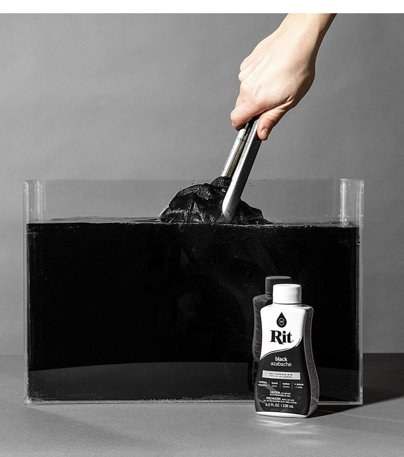 Dye Colour: Black Volume: 236ml Brand: Rit Item weight: 8 Ounces Item form: Liquid Compatible Material: Silk Restore faded clothing back to a rich black in a few easy steps Overdye clothing of any colour to a vibrant black Perfect for many types of fabric, including cotton, linen, silk, wool, rayon, ramie or nylon Includes Jet Black All-Purpose Dye, our darkest, richest black ever. Proudly non-toxic and safe for sewer and septic systems Also includes Colour Stay Dye Fixative, our secret weapon to reduce bleeding and fading and a pair of gloves Do your part to reduce your carbon footprint by dyeing clothing instead of buying new, which reduces CO2 emissions by 74%