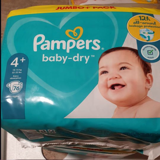ASDA Pampers Baby-Dry Size 4 Nappies Jumbo+ Pack 76pcs Size: Nappy Size 4+76pcs in a pack Benefits Safety leg cuffs help prevent leaks around the legs.Flexi-side wings adapt comfortably to your baby’s waist for a secure fit.Cool designs show you the front and back.Tested and certified according to Standard 100 by UK Oekotex.Just like you, we put your baby’s safety first: Pampers Baby-Dry nappies are dermatologically tested and approved by the dermatologists of the British Skin Foundation. They are tested and certified according to Standard 100 by Oekotex.