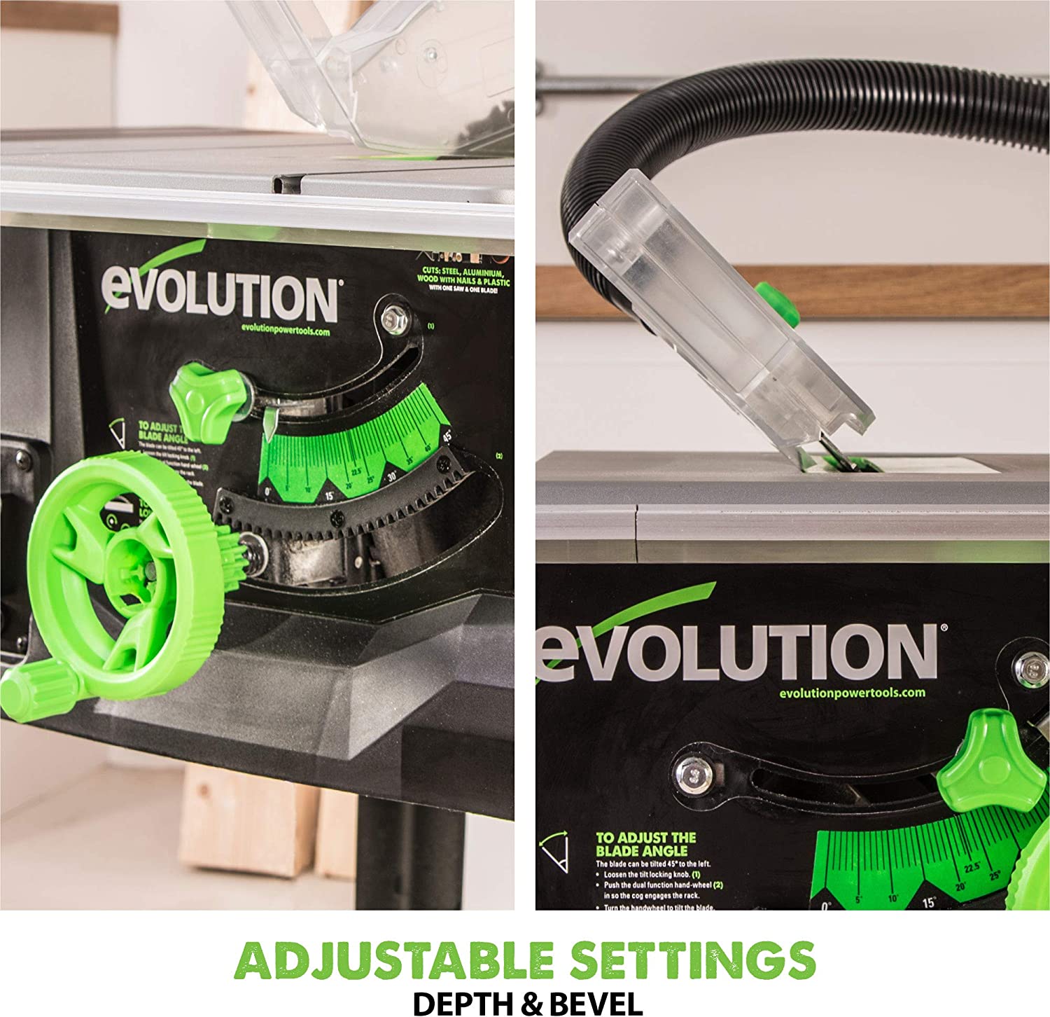 | Plastic Power Source | ACUtilises patented Evolution multipurpose cutting technology, optimized to cut mild steel, non-ferrous metals, wood, and plastic with one blade Cutting mild steel leaves an instantly workable finish, producing no heat, no burr, and virtually no sparks Powerful 1500 W hi-torque motor, bevel cutting up to 45 Degrees, cutting depth of up to 85 mm through wood, adjustable rip fence, and dust extracti… |