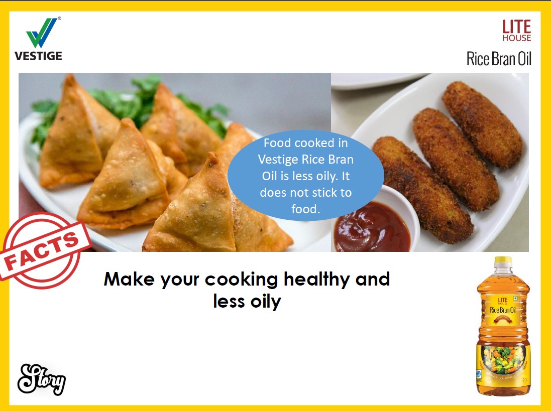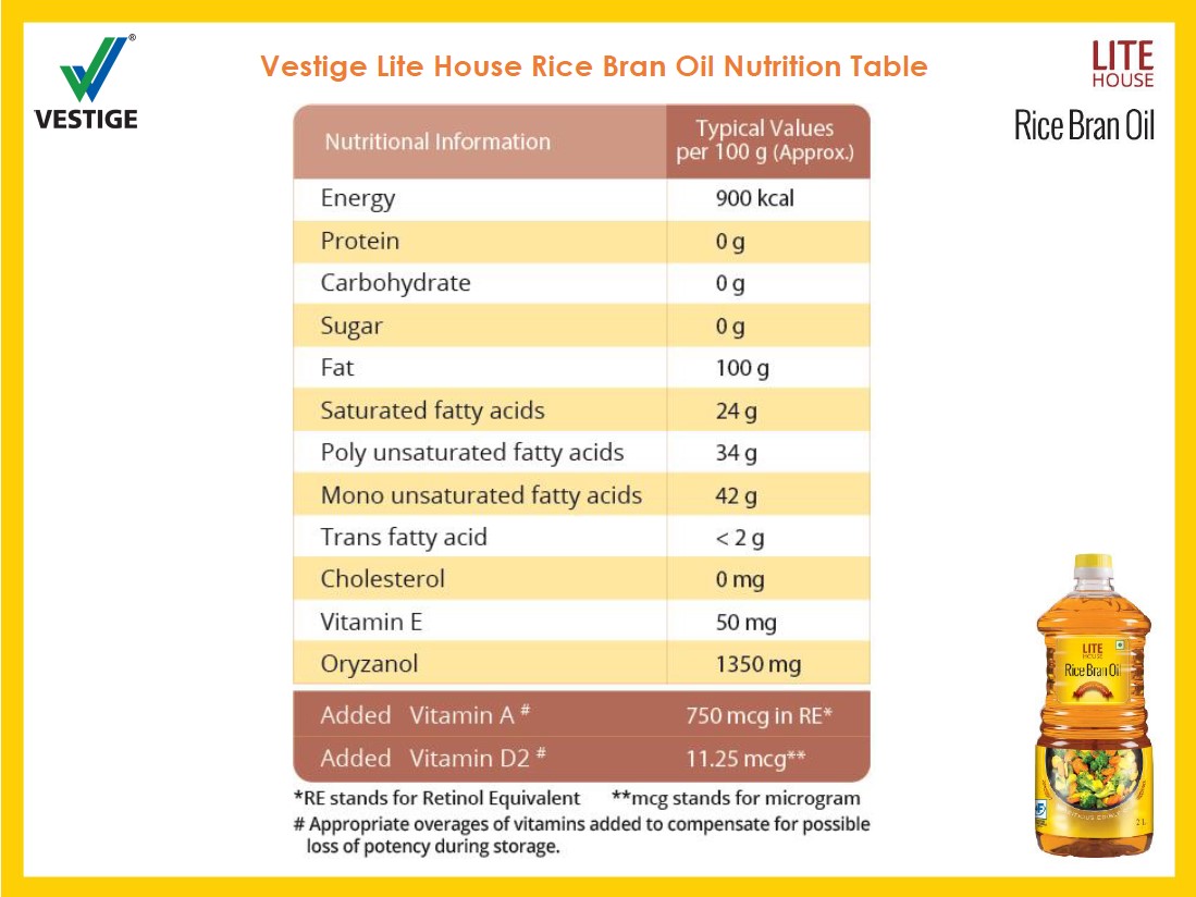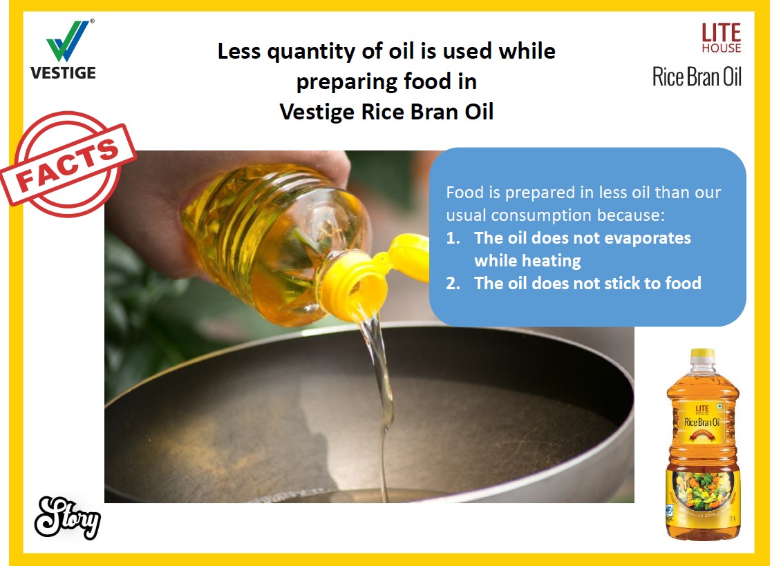 | Good for Weight Management | The presence of healthy fats can help regulate metabolism and prevent unhealthy fat accumulation.Why Choose Vestige Rice Bran Oil?A comparison chart with other oils (sunflower, mustard, olive) highlighting its advantages. |