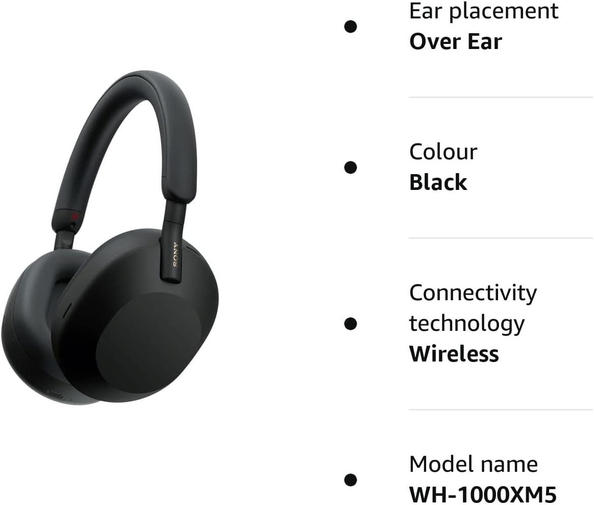 Form factor: Over Ear Connectivity technology: Wireless Sony WH-1000XM5 Dimensions: 27.62 x 21.67 x 7.59 cm Wireless communication technology: Bluetooth The product is refurbished, is fully functional and in excellent condition. - This pre-owned product has been professionally inspected, tested and cleaned. - This product is in "Excellent condition". It shows no signs of cosmetic damage visible from a distance of 30 centimeters. - This product will have a battery that exceeds 80% capacity relative to new. - Accessories may not be original, but will be compatible and fully functional. Product may come in generic box. - This product is eligible for a replacement or refund within 1-Year of receipt if it does not work as expected The new Integrated Processor V1 brings our (already!) market-leading noise cancellation technology to the next level by releasing the full power of our HD Noise Cancelling Processor QN1. Exceptional High-Resolution Audio quality is delivered thanks to precision engineering. When using these noise-canceling headphones for calls, our Precise Voice Pickup Technology and newly enhanced wind noise reduction will also ensure that you can hear and be heard clearly. bright, perceptive, and smart. Without you having to take off the over-ear headphones, Speak-to-Chat automatically pauses the music when you wish to hold a conversation and Adaptive Sound Control automatically modifies the sound settings based on your surroundings and activities.These Bluetooth headphones may be synced with two devices simultaneously for maximum convenience. Swift Pair makes pairing with your PC or tablet straightforward, and Fast Pair will locate the WH-1000XM5 if you can't.
