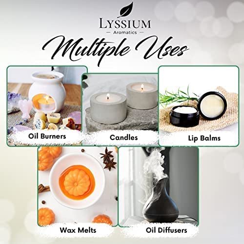 MADE IN ENGLAND! Sensual scents from some of the best fragrance oils available can fill your house or car. nicely wrapped and beautifully fragrant! Each fragrance is painstakingly created and made in the UK to thrill your senses.QUALITY FRAGRANCES FOR ALL YOUR ART & CRAFT NEEDS - These pure oils are ideal for making soap, bath bombs, and candles. They are simple to deal with and retain their smell nicely. They also function great with reed diffusers!The ideal present Are you searching for the ideal gift or stocking stuffer for the woman in your life? A treat for you or a car air freshener for your parents! There is something for everyone in the selection of more than 100 high-quality fragrances.THE ULTIMATE AROMATHERAPY EXPERIENCE - Fragrances have a significant impact on how you feel. Utilize our wonderful scents to unwind, sleep, or revitalize. Just add to your diffuser, humidifier, or room burner to fill your space with mood-altering aromas. Alternatively, you can add to your soap, wax, or candles to create the ideal handcrafted present.YOU CAN TRUST FRAGRANT OILS - The UK company Lyssium has a reputation for offering high-quality, pure scent oils. We offer a customer satisfaction guarantee on all of our oils. Upon request, we will be pleased to provide you with the data sheets for any of our fragrances.