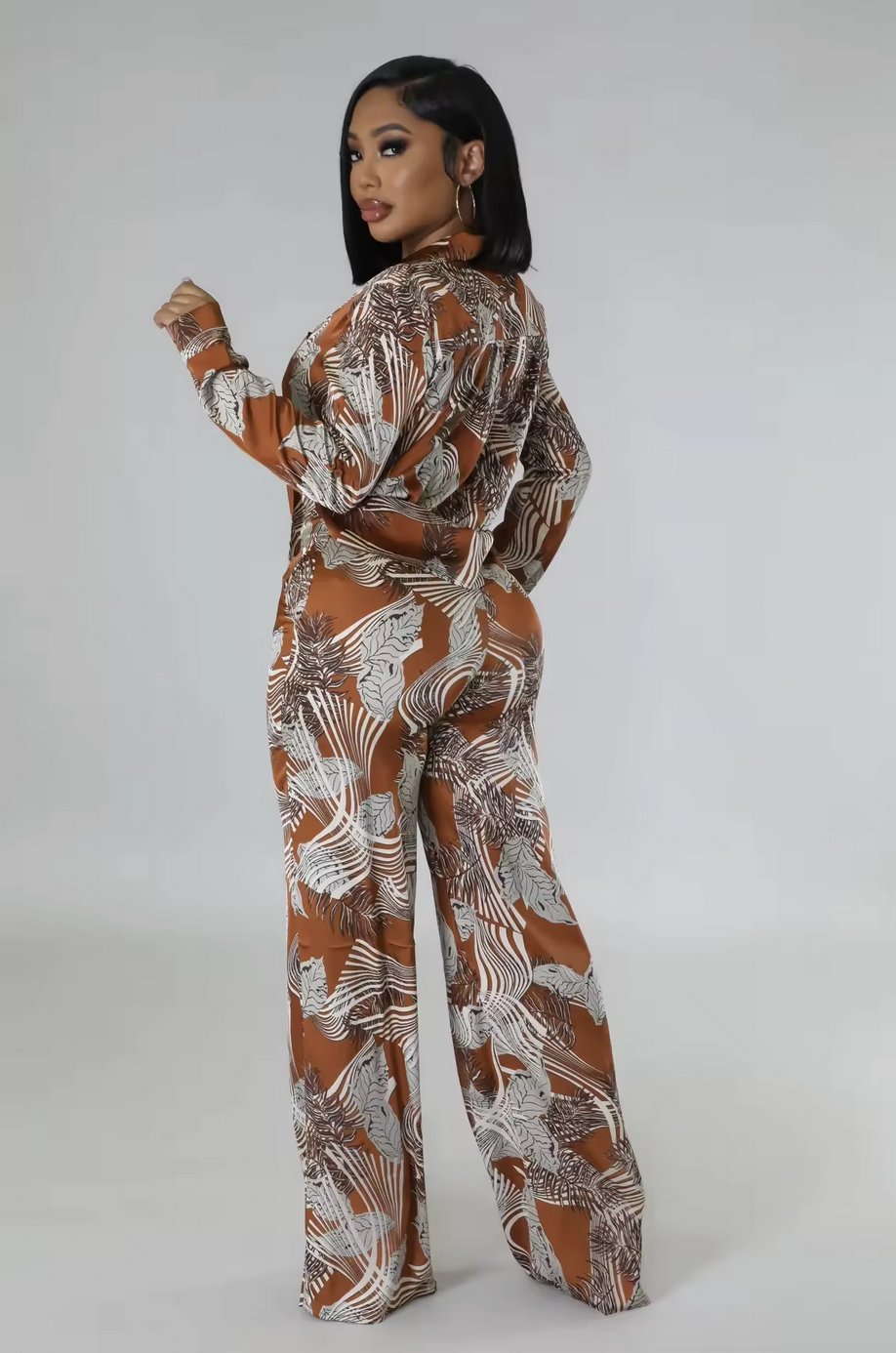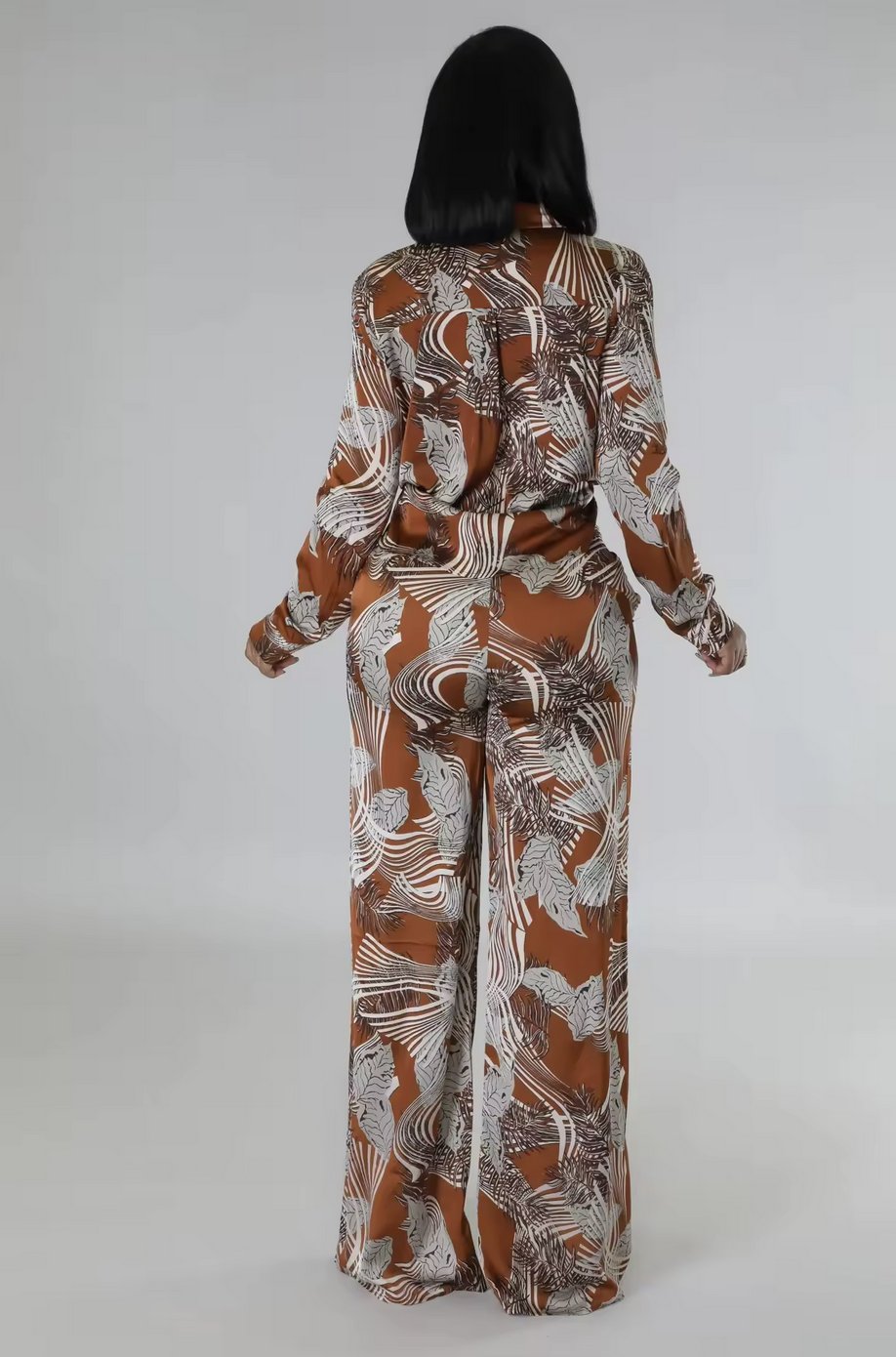 Popular Fashion Casual Women Loose Two Piece Set Print Suits Shirt And Wide Leg Long Pants