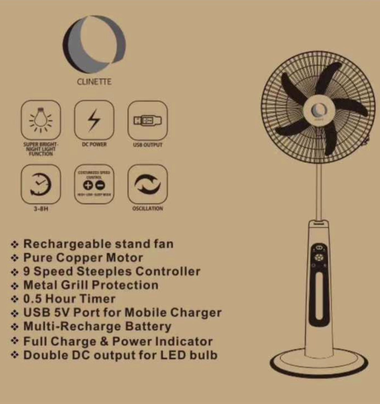 1- Rechargeable Solar fan with light and two bulbsThe rechargeable Solar fan comes with a Pure copper motor9-speed steeples controller Metal Gr