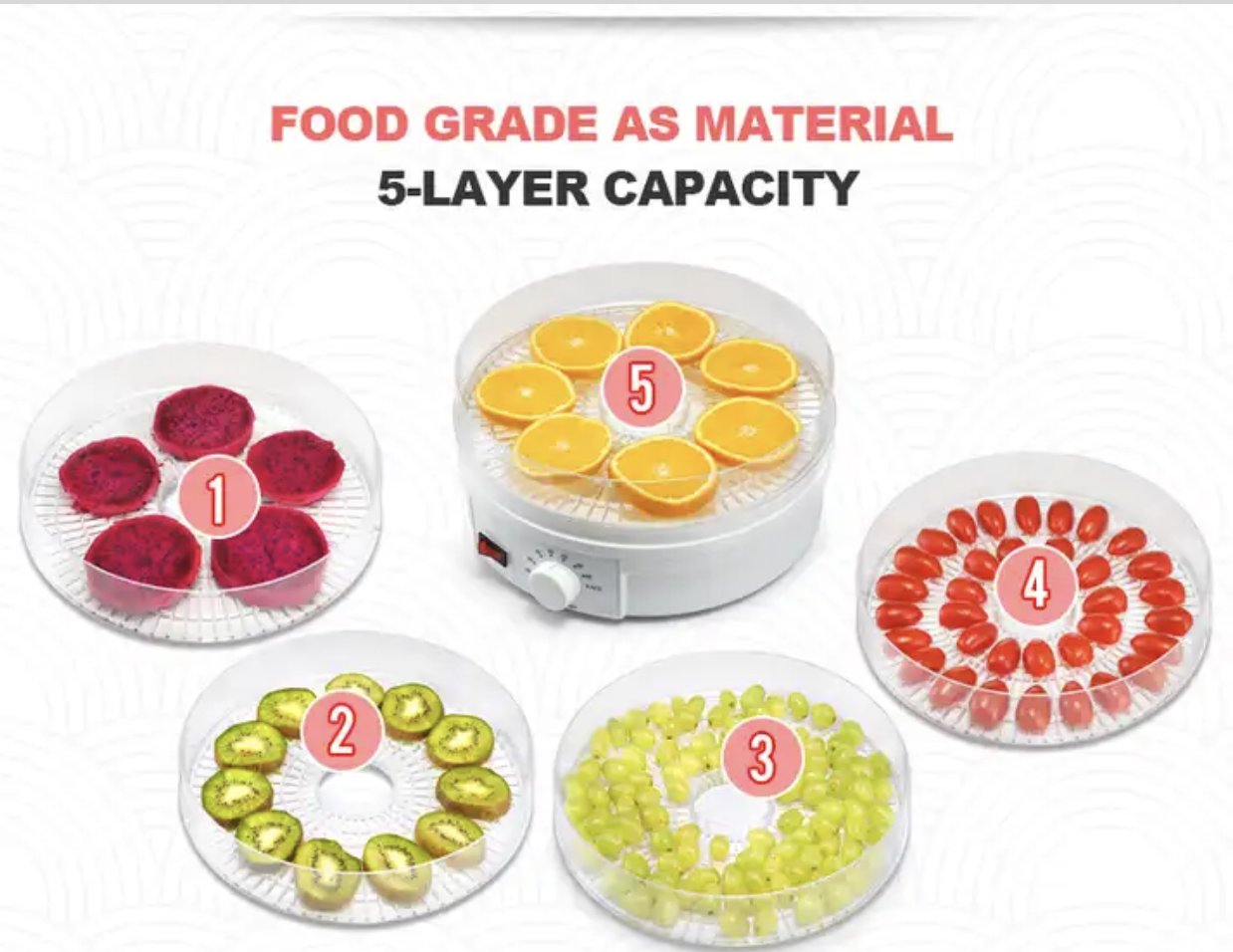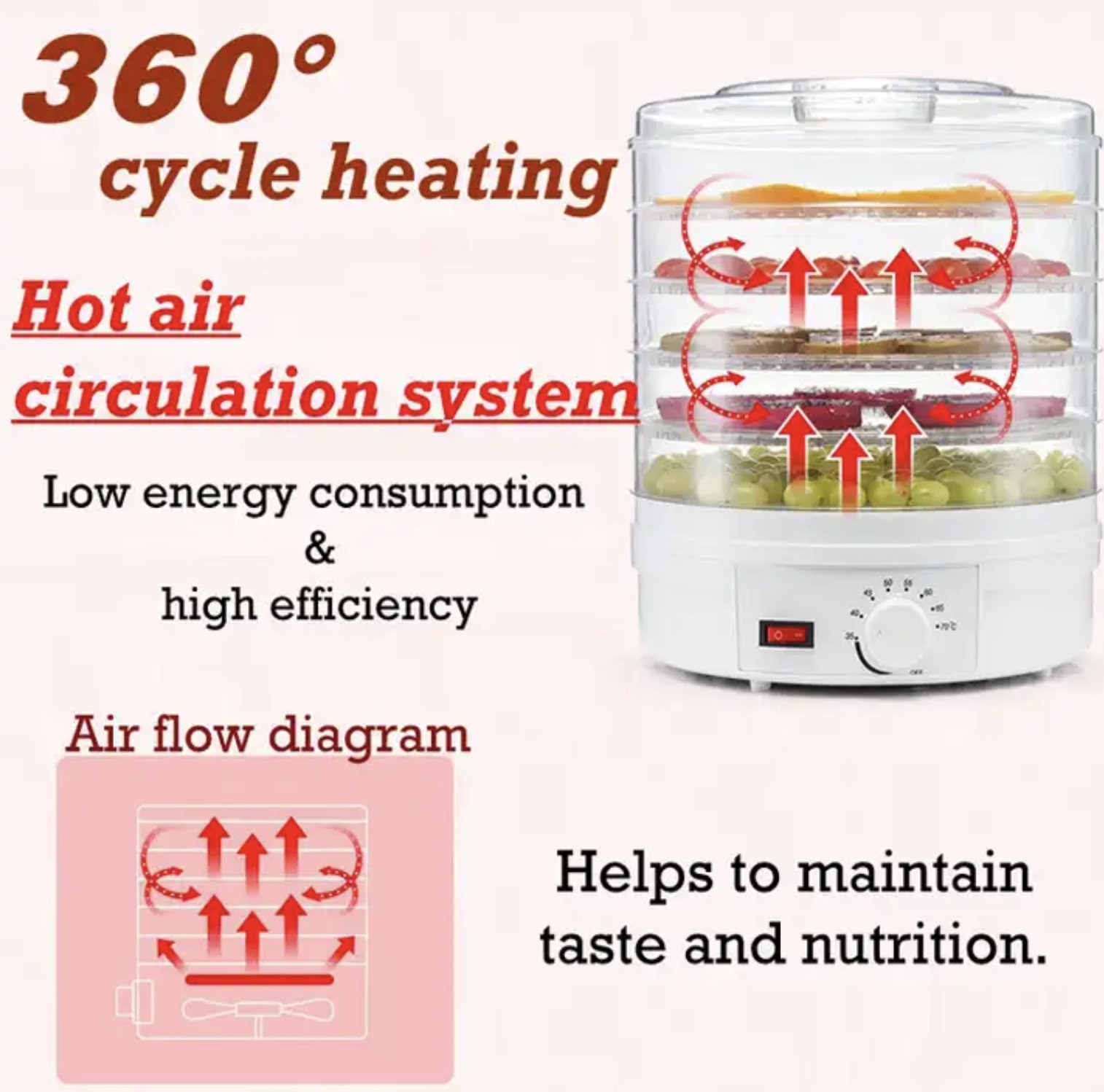 1- Product Name: Mini home fruit dryerPower (W): 350Voltage (V): 110V-240VTray: 5 / (3.5cm)Product size: 280*280*268mmPacking size: 310*310*360