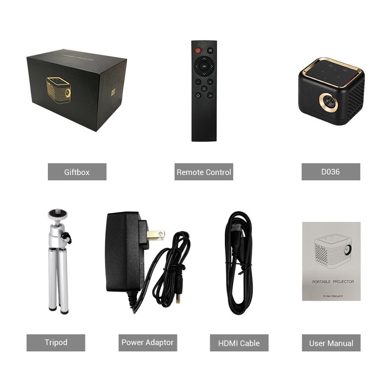 1- Model Number: D036Product Name: Mini smart projectorCase Material: Stainless SteelCase Color: Gold+black / Red+ black/Bule+black...Case Size