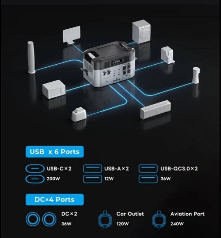1- Capacity: 2048wh (51.2v,40Ah)Surge input:4000WSolar input: Max.1000W(MPPT)12-120V/15A,1*XT60portAC input:1800WMac input: 2800W, with AC+sola