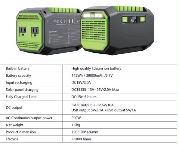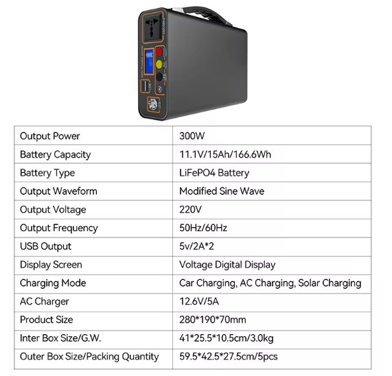 1- Power Storage AC Output: 200WPower Storage Capacity: 151WhUSB Output x 1: 5V/2.4AUSB Output x 2: QC3.0DC Output: 9-12.6V/10ADC Input Adaptor
