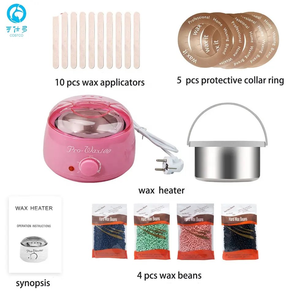 1- Set includes: wax heater / waxing stick / 4 bags of wax beans (100g per bag) / 5 pieces of protective padsType: WAX HEATERPlugs Type: AU, UK