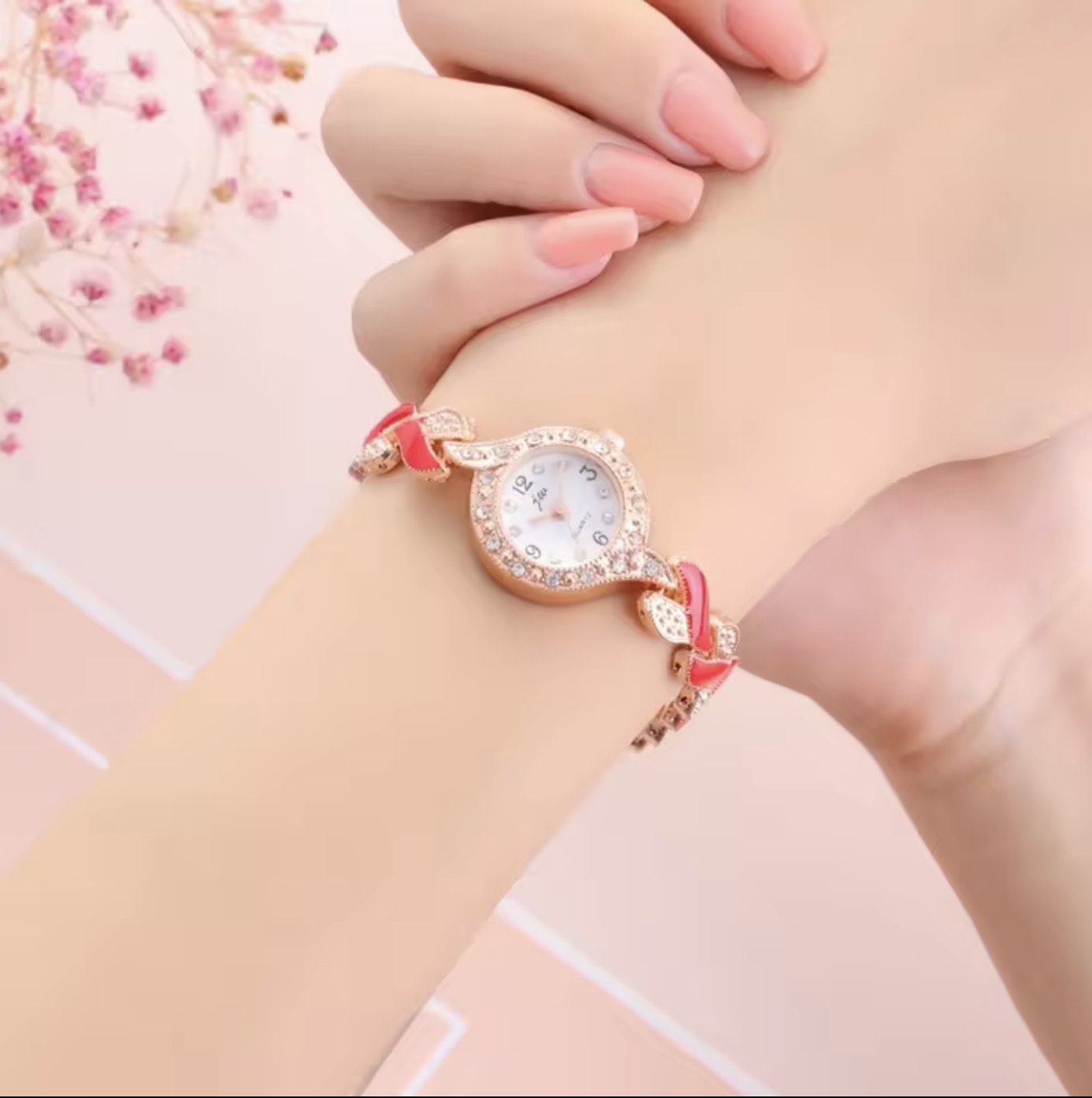 Wrist available in red colour Gorgeous Two-Tone Design: Gold Plated and RED Coloured Stone Set Case and Bracelet Radiant Rose Sunray Dial: Adds a Touch of Charm to Your Look Precision Quartz Movement: Keeps Accurate Time and Never Needs Winding Versatile and Chic: Perfect for Dressing Up or Down, from Work to Weekend