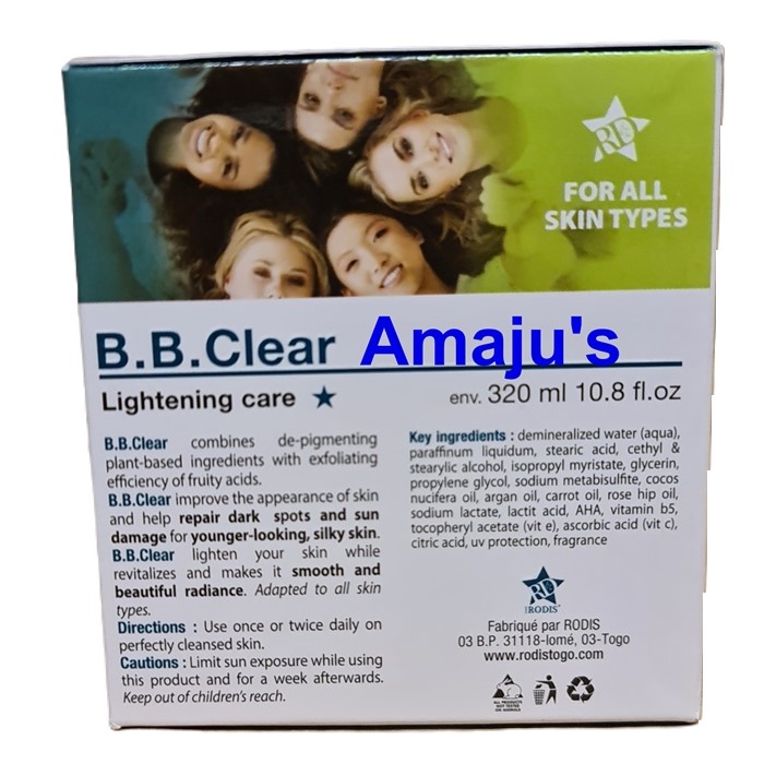 B. B. Clear is a body cream with fruits acids and whitening complex, which is developed to whiten, moisturise and purify your skin. It is also enriched with vitamin A and E to protect and promote skin care; hence, protect your youthfulness, soften your skin, refreshes and makes and make it so much sensation.