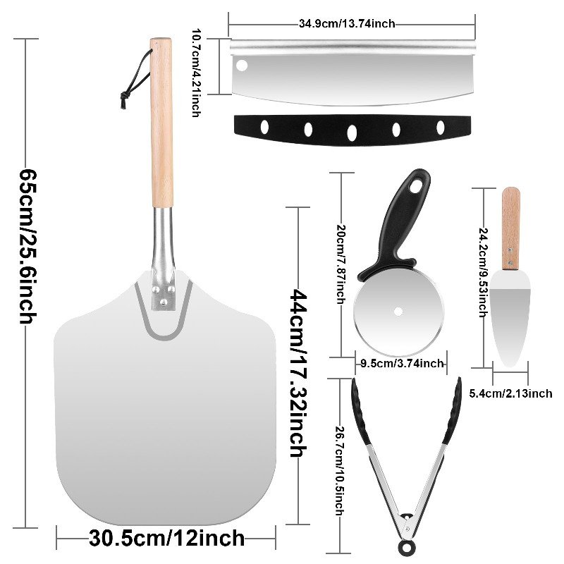 | Material | Aluminum + Stainless Steel + Wood + PP 2. Pizza Peel--17.32 x 12 inches(L x W); 3. Rocker Cutter--7.87 x 3.74 inches(L x W); 4. Removable Wooden Handle--8.27 inches Long;5. Pizza Spatula--9.53 x 2.13 inches(L x W);6. Pizza Cutter--13.74 x 4.21 inches(L x W);7. Food Clip--10.5 x 1.38 inches(L x W)8. |